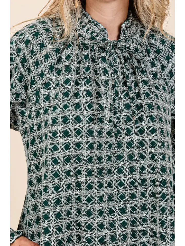 Self-tie detail on the neck, long sleeve, smocked cuffs